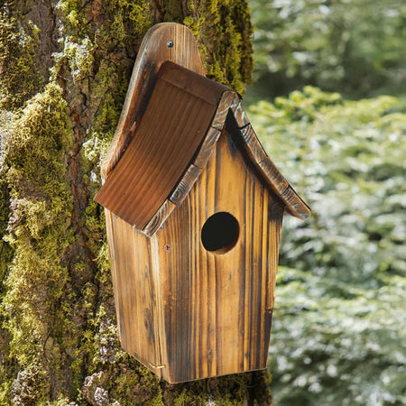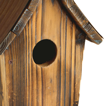 - Wooden shelter body tapers toward the base, allowing birds to easily access the unpainted interior.