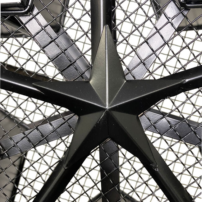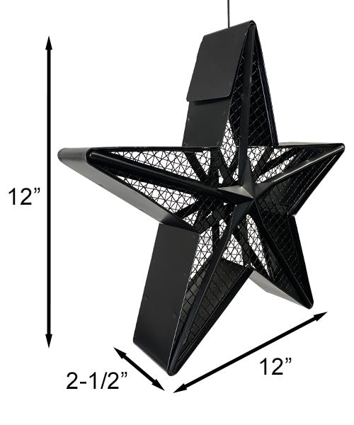 Adorn your yard with a fun and unique haven for nut-eating birds with the Woodlink Rustic Farmhouse Star Bird Feeder. This classic, star-shaped, metal mesh feeder provides a contrast to your bird garden's natural environment and beckons a wide assortment of avian visitors, creating a bustling dining zone. This bold piece is crafted from a steel frame with 0.25" square mesh, and holds 0.85 quarts of sunflower seed, peanut chunks, or other hardy offerings, allowing multiple birds to cling to the frame and access the feed. For easy refilling and maintenance, simply slide the feeder's top panel up the included hanger. A raised star on either side of the item acts as a visual centerpiece, lending an extra bit of pizzazz as you enjoy your view of dining birds, and the black, powder coated finish on the steel body offers durability. Hang this brilliant feeder from a tree or hook in your bird garden using its attached cable. Add bold and heavenly charm to your bird garden with this Rustic Farmhouse Star Bird Feeder.
