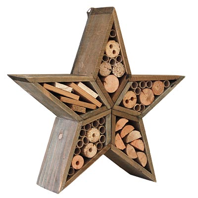 Offer beneficial insect superstars a fitting home in your garden with this Woodlink Rustic Farmhouse Star Insect House. Providing shelter to solitary bees and other insects welcomes them into your yard, and these pollinators can often help your flower garden or vegetable plants thrive. The familiar, five pointed, star shaped frame creates a fun look in your yard, and each arm has varied openings to house a wealth of insects. Cardboard tubes dotting the unit are fantastic for horn-faced and orchard bees, while solid wooden tubes with drilled holes in them are favorites of mason bees. Overlapping wooden slats and semicircles create crevices, which lacewings and other bees often use for roosting. These pieces all rest inside the wooden frame, and its solid back helps protect the bees. A metal hanger makes it simple to place the unit against a wall, fence, or post, and the varied brown tones celebrate the natural world. Place a brilliant shelter for bees in your backyard with this Rustic Farmhouse Star Insect House.