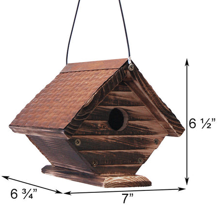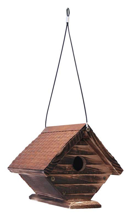 Invite small songbirds into your garden by placing this Woodlink Rustic Hanging Wren House in it. The varied materials and wealth of brown tones on this charming shelter perfectly enhance your bird garden, while creating a classic home for wrens or chickadees. Its diamond shape forms a recognizable roost, and a 1.125" diameter opening on the front allows small songbirds to use the unit. Lapped wood here and on the back panel offer an architectural hint, and the pitched roof with overhang protects the nest from rain. Sheet metal with a basketweave pattern covers the roof, and its rust brown color furthers the rustic look. An attached cable makes it easy to hang this home, and its flat base removes fully for seasonal cleaning. The wood body and metal accent combine for a timeless look, and the size is perfect for your small feathered friends. Provide a classic roosting spot to select songbirds with this Rustic Hanging Wren House.