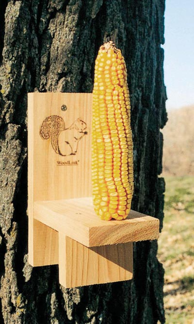 Give squirrels a comfortable place to dine with the Woodlink Squirrel Chair Ear Corn Feeder. The shape of this charming feeder evokes a tall backed chair, with intersecting vertical and horizontal pieces of cedar forming the frame. An additional wood piece rests under the horizontal section, creating an extra chair leg and helping the unit remain stable on a flat surface. A sturdy screw at the end of this feeder faces upward, and easily holds an ear of corn for the delight of your squirrels. A laser etched image of a squirrel in a dining position rests on the back of the feeder, for added interest. Use the two predrilled holes to mount this item to a post or tree, and ensure it is level for squirrels to rest on it easily. Direct squirrels away from your bird feeder to their own food source using this Squirrel Chair Ear Corn Feeder. Made in the USA.