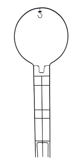 Overlapping, metal rods form a grid pattern creating the base of this stand, its square and rectangular openings contrasting the round top and offering spaces for tendrils to grip as they grow upward. The heavy-duty, 9.5" long and 8" wide, four-pronged foot inserts easily into soil, and the black powder coating makes for durability throughout many seasons. For added activity and visual interest, suspend a 10" diameter or smaller hanging basket or bird feeder (not included) from the hook at the top of the piece, for a lush display of color. To fend off ants and other crawling pests, this attached hanger includes an ant guard, while the integrated hummingbird swing encourages delightful avian antics right in your backyard. Amplify your yard's classic, natural beauty with this Black Trellis Hanger with Hummingbird Swing.
